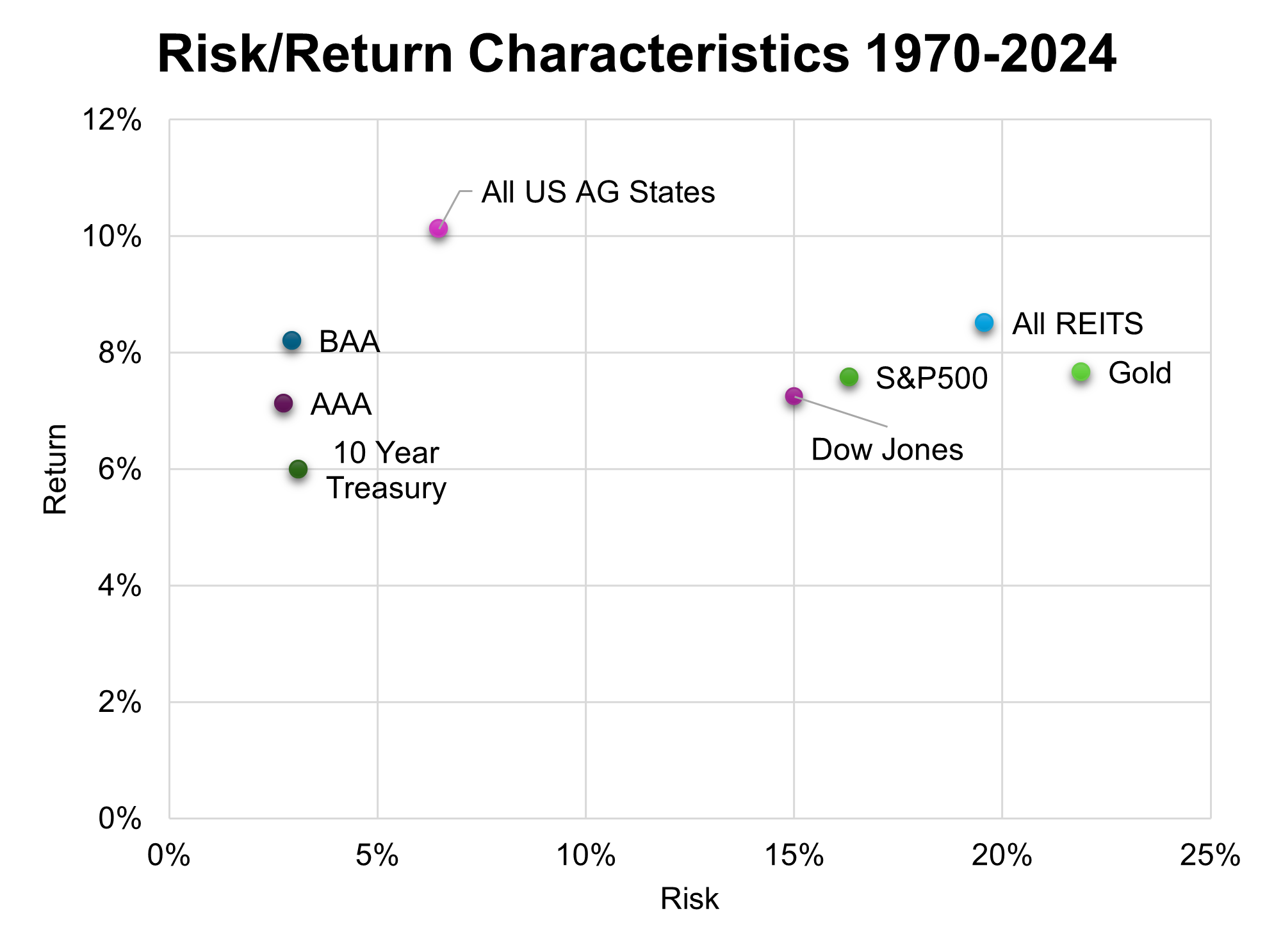 [This Risk/Return Graphic is based on data from the TIAA Center for Farmland Research (1970–2024), farmland occupies a unique investment quadrant: offering equity-like returns (~10%) with the low volatility profile of fixed income (~7%).]